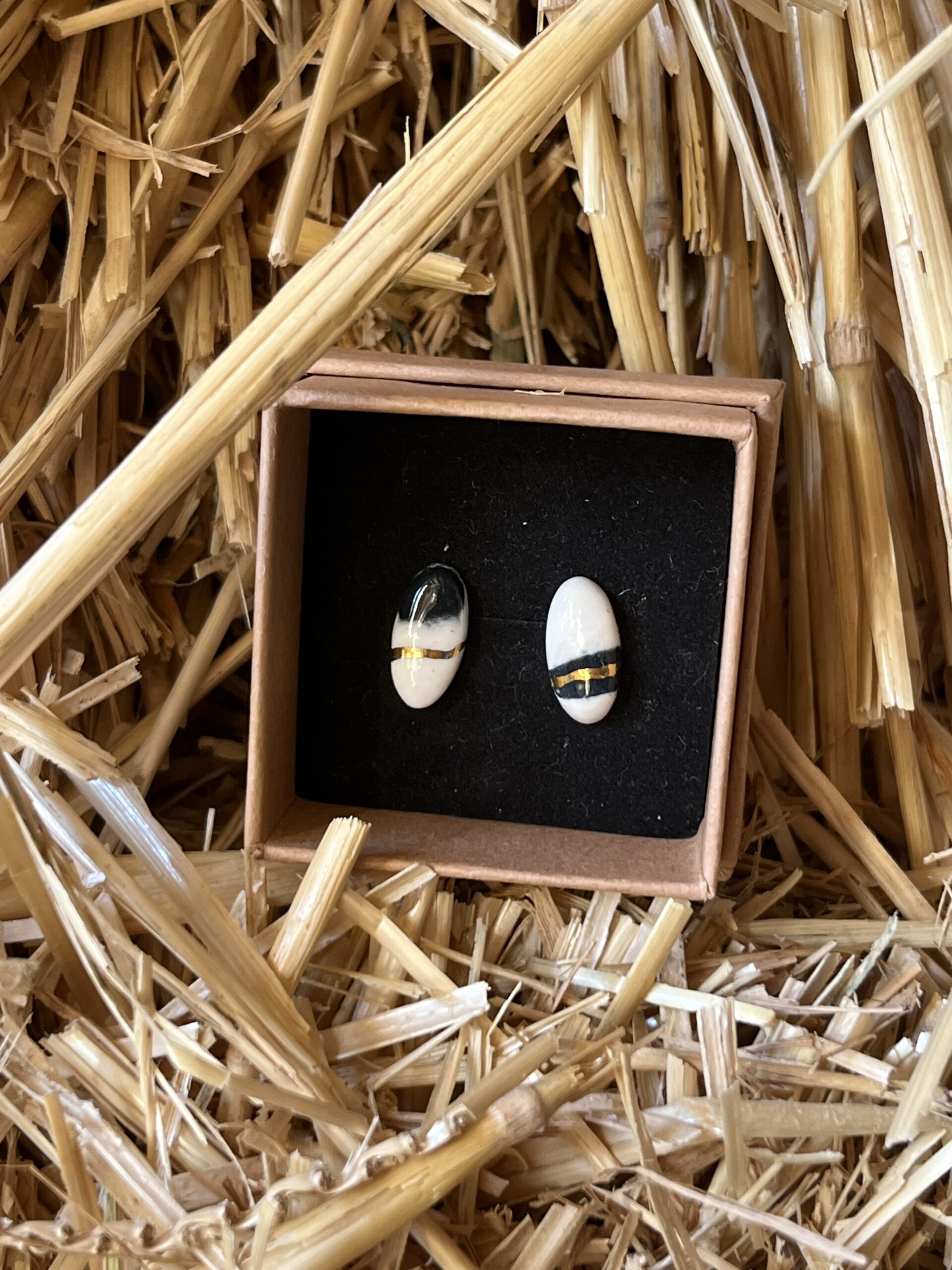 Chaque pièce est unique, ces boucles d’oreilles sont en porcelaine, blanche et noir, elles sont accompagnées d’une fine ligne d’or. Ce qui permet de souligner la forme et d’avoir un résultat unique.