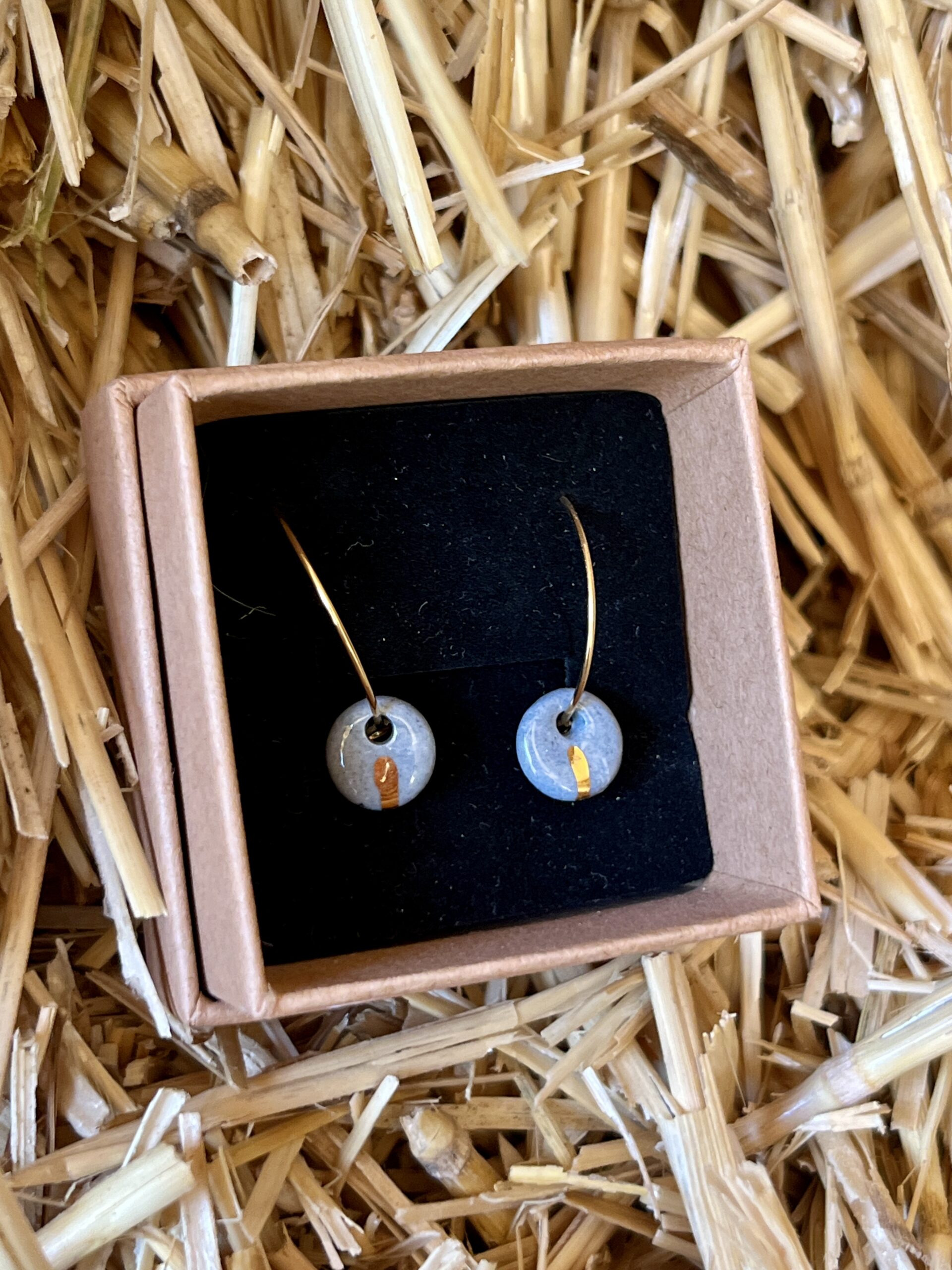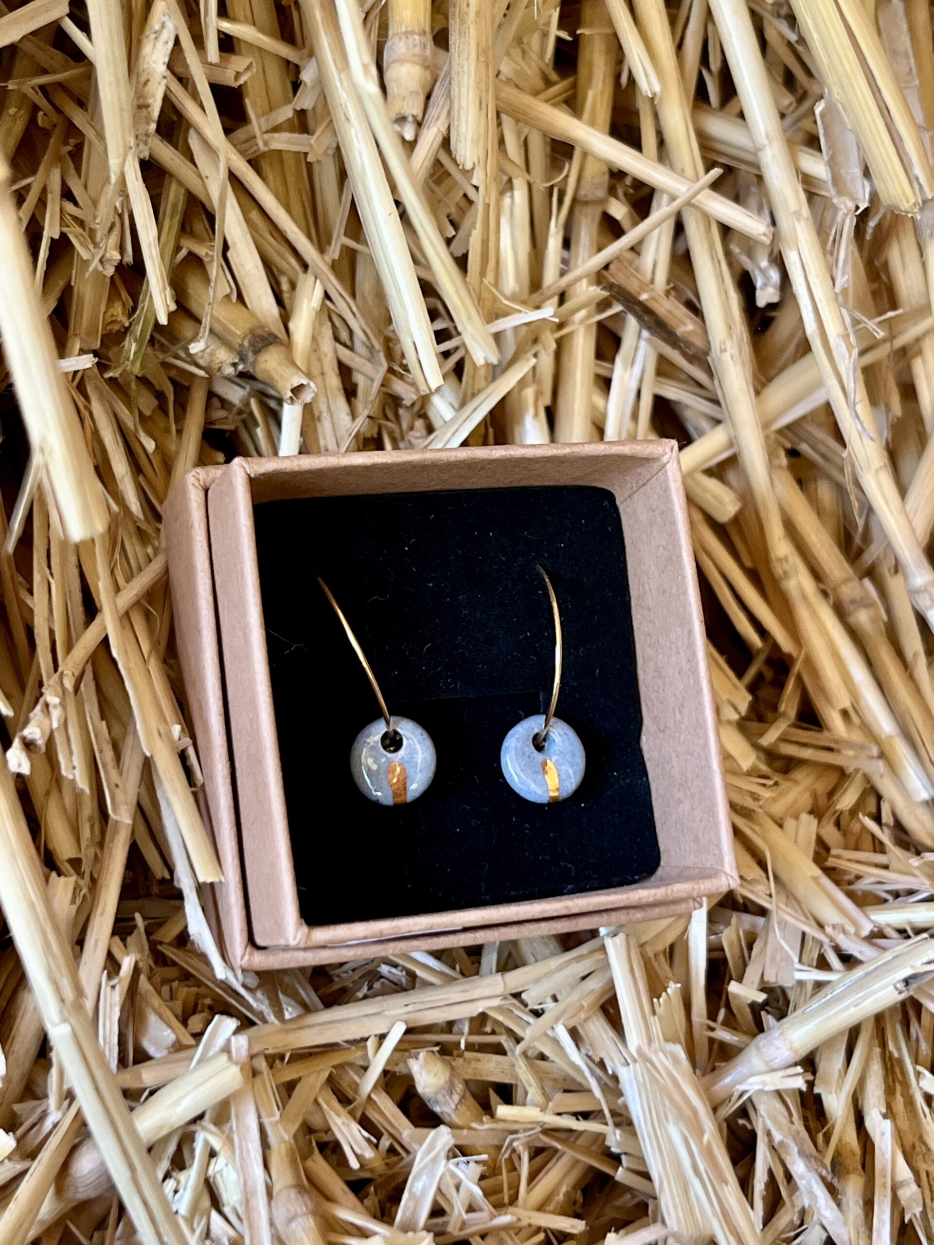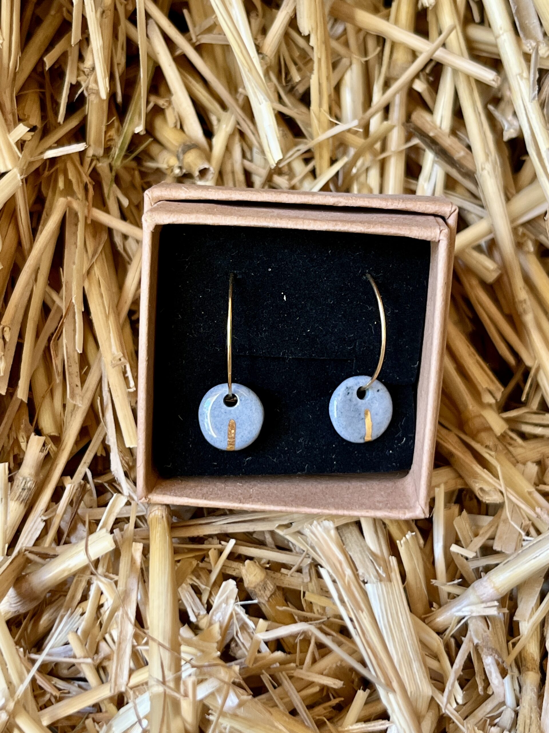Chaque pièce est unique, ces boucles d’oreilles sont en porcelaine grises, elles sont accompagnées d’une fine ligne d’or. Ce qui permet de souligner la forme et d’avoir un résultat unique.