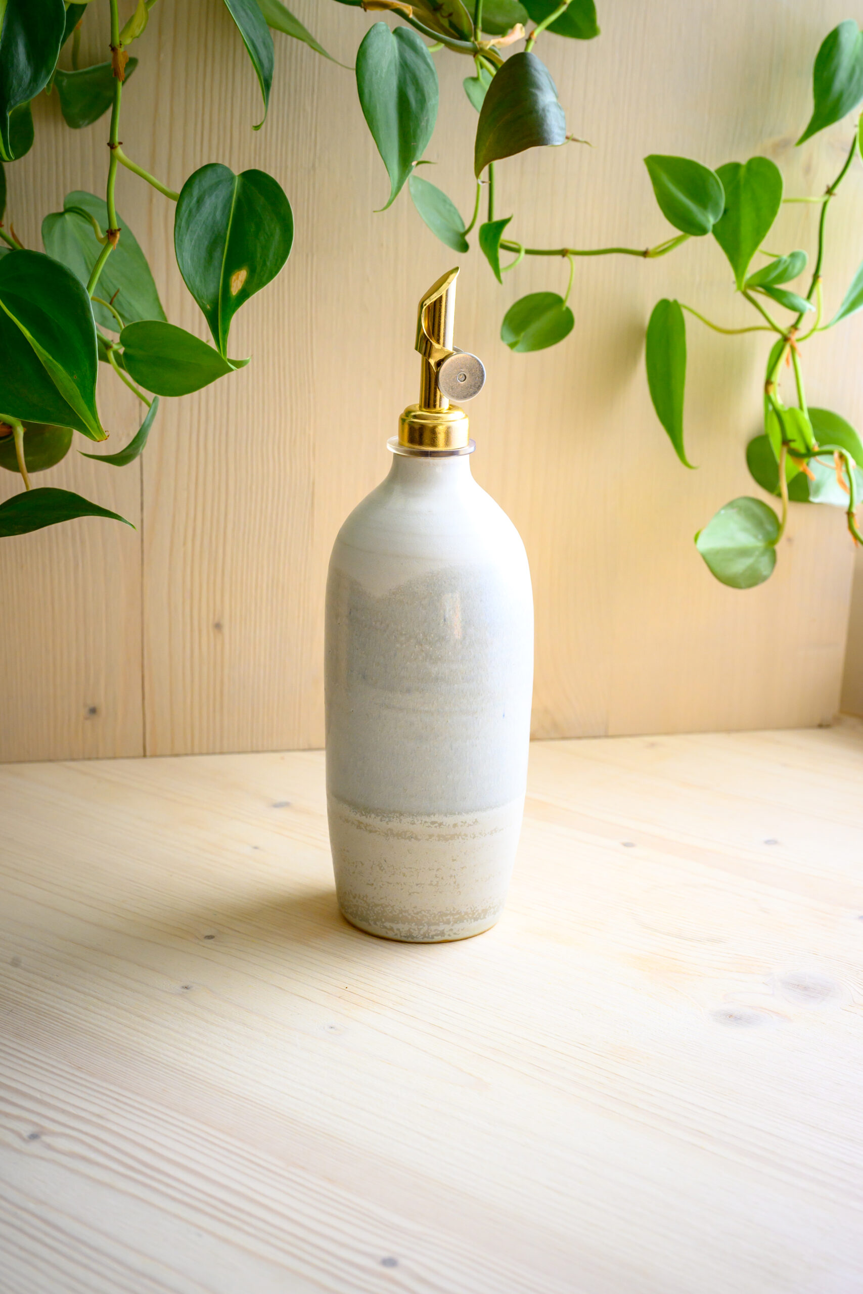 Bouteille en grès émaillé blanc, au design simple et naturel. Elle est équipée d’un bouchon intelligent qui fonctionne par gravité pour bien conserver vos huiles.