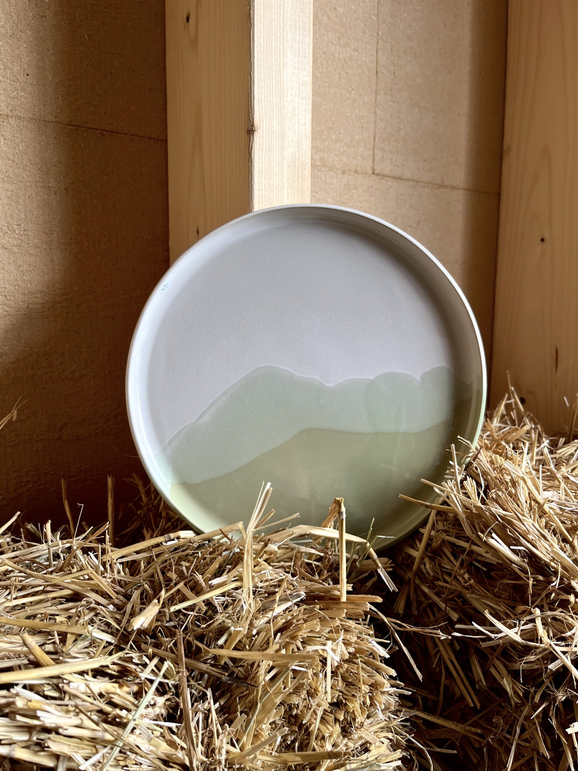 Cette assiette aux nuances de vert et de blanc évoque un paysage en mouvement, comme une brume légère posée sur une prairie au petit matin.