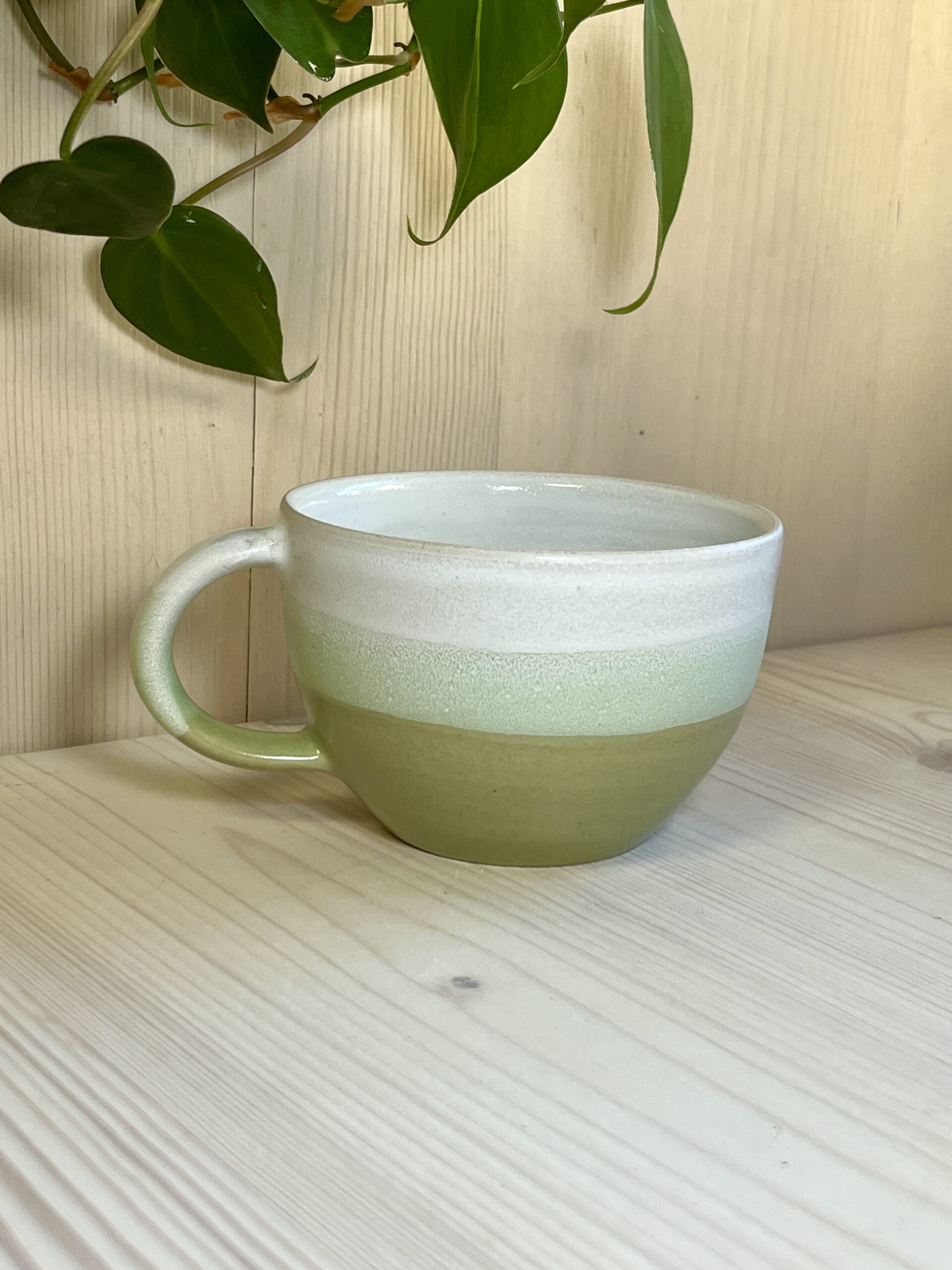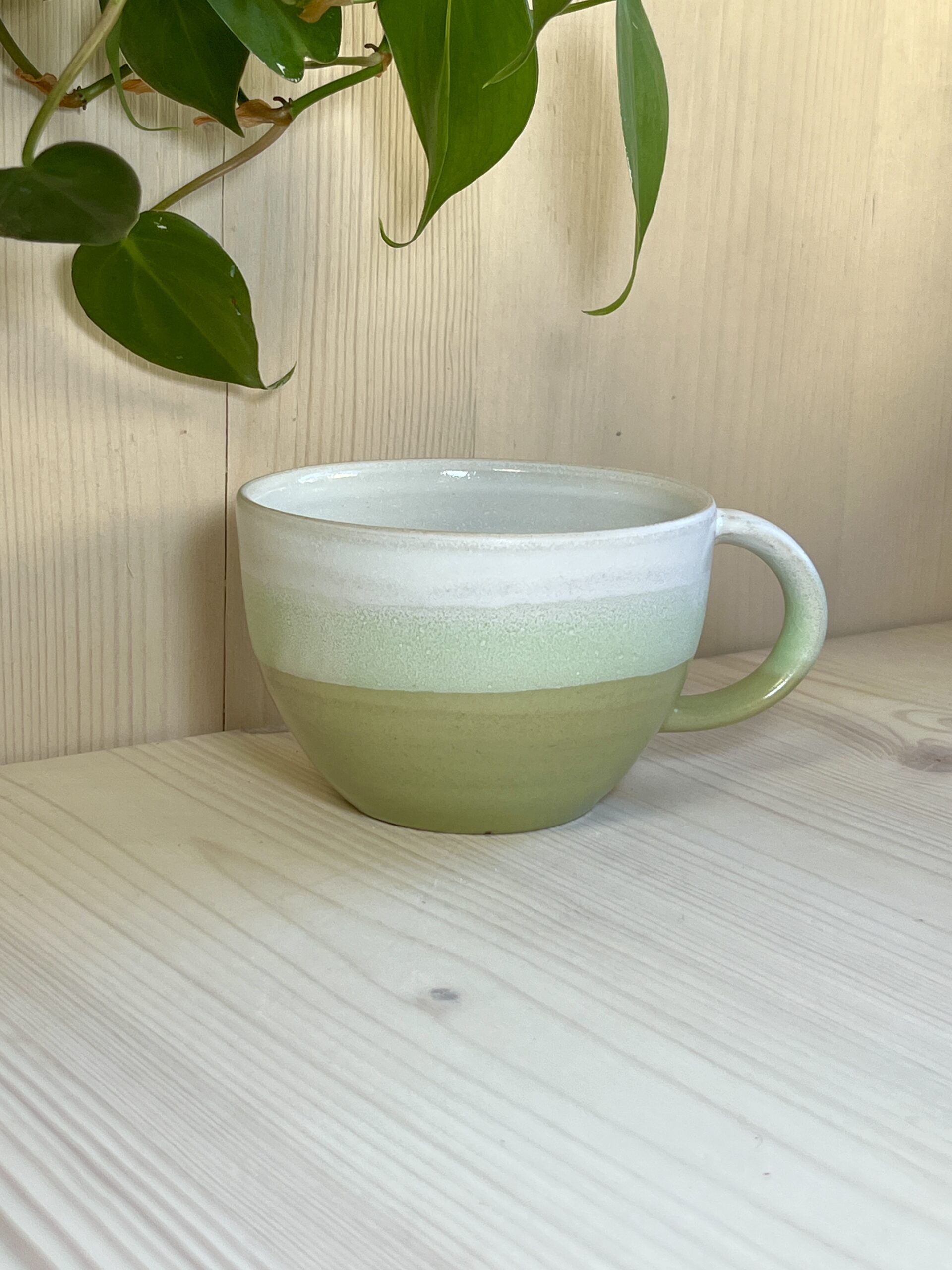 Voici la tasse Ninimenta. Elle est émaillée dans des tons très doux : blanc, vert, et une touche de vert anis au centre.