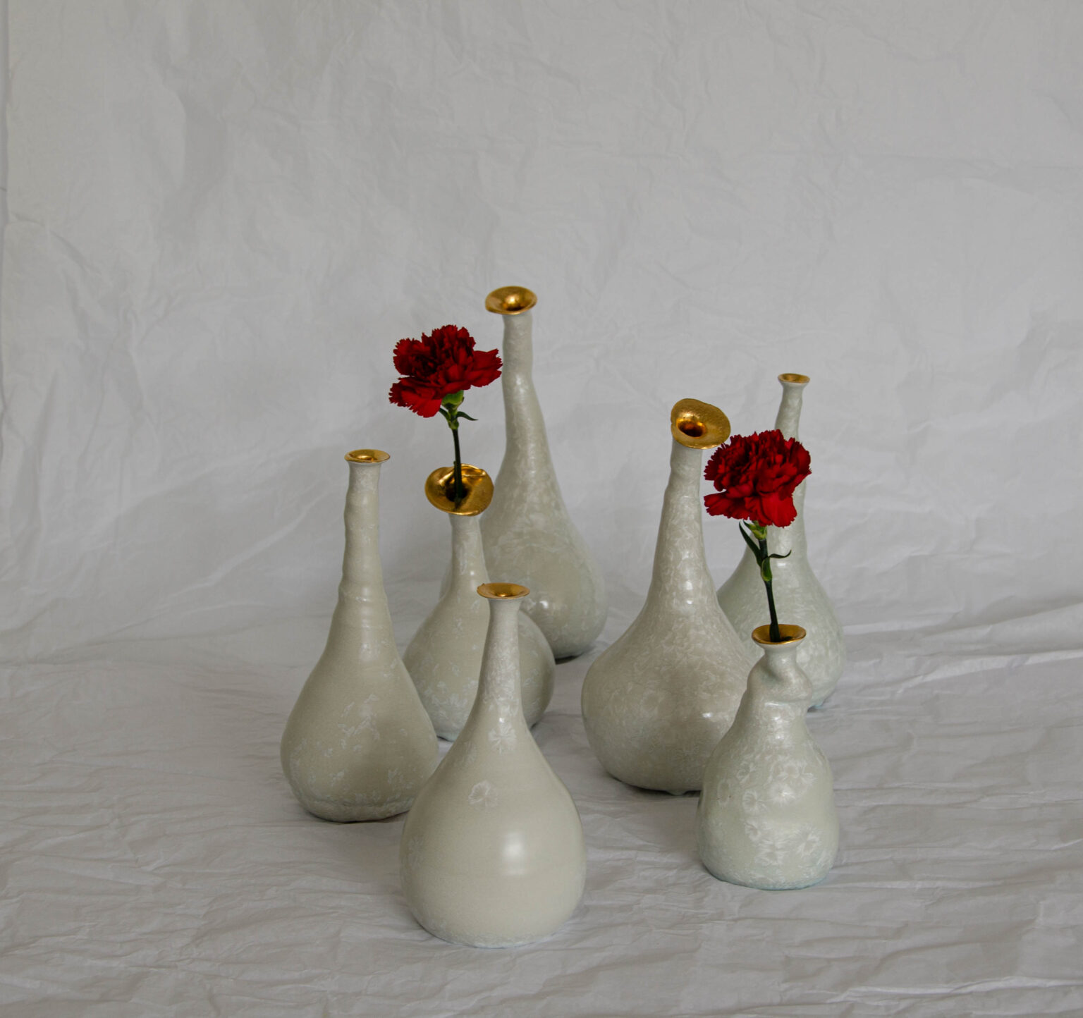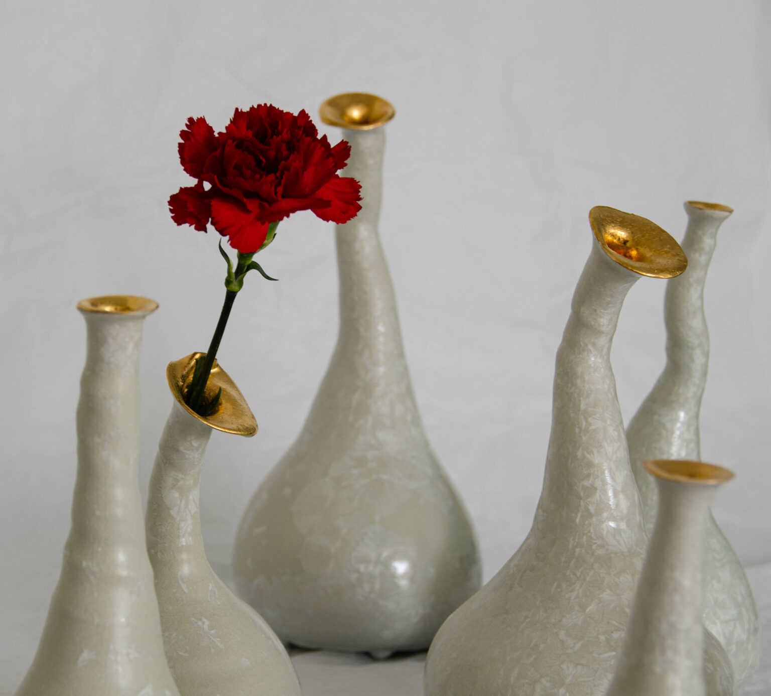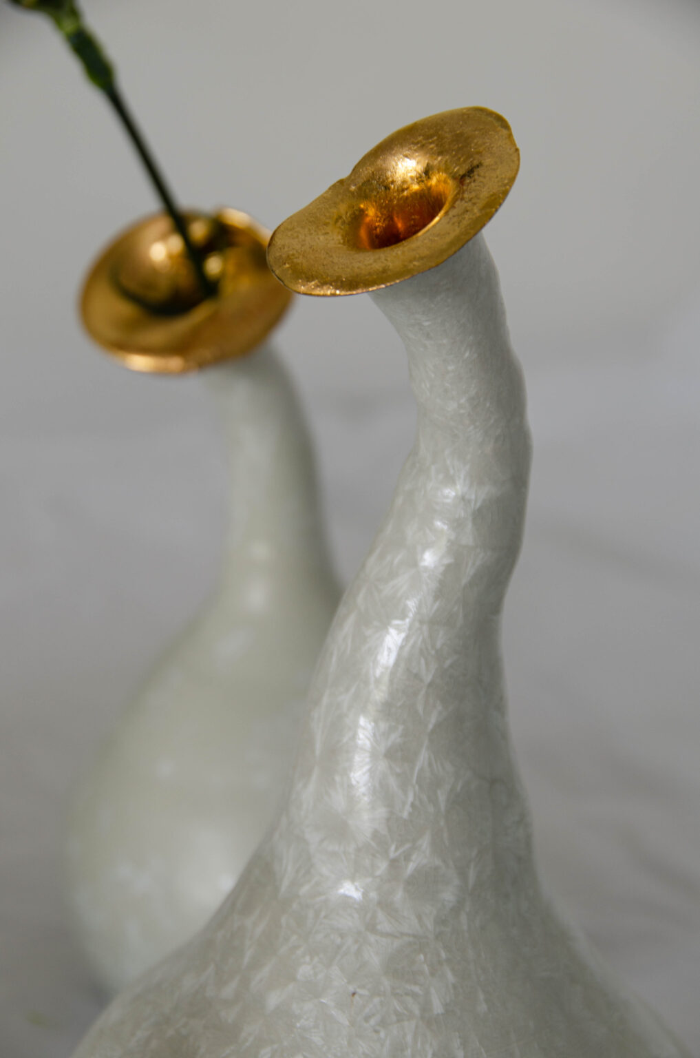 Les danseuses sont réalisées au tour de potier. Ces vases sculpturaux en porcelaine sont recouverts d’un émail à cristaux, tandis que les têtes sont rehaussées d’or. Chaque pièce est unique.