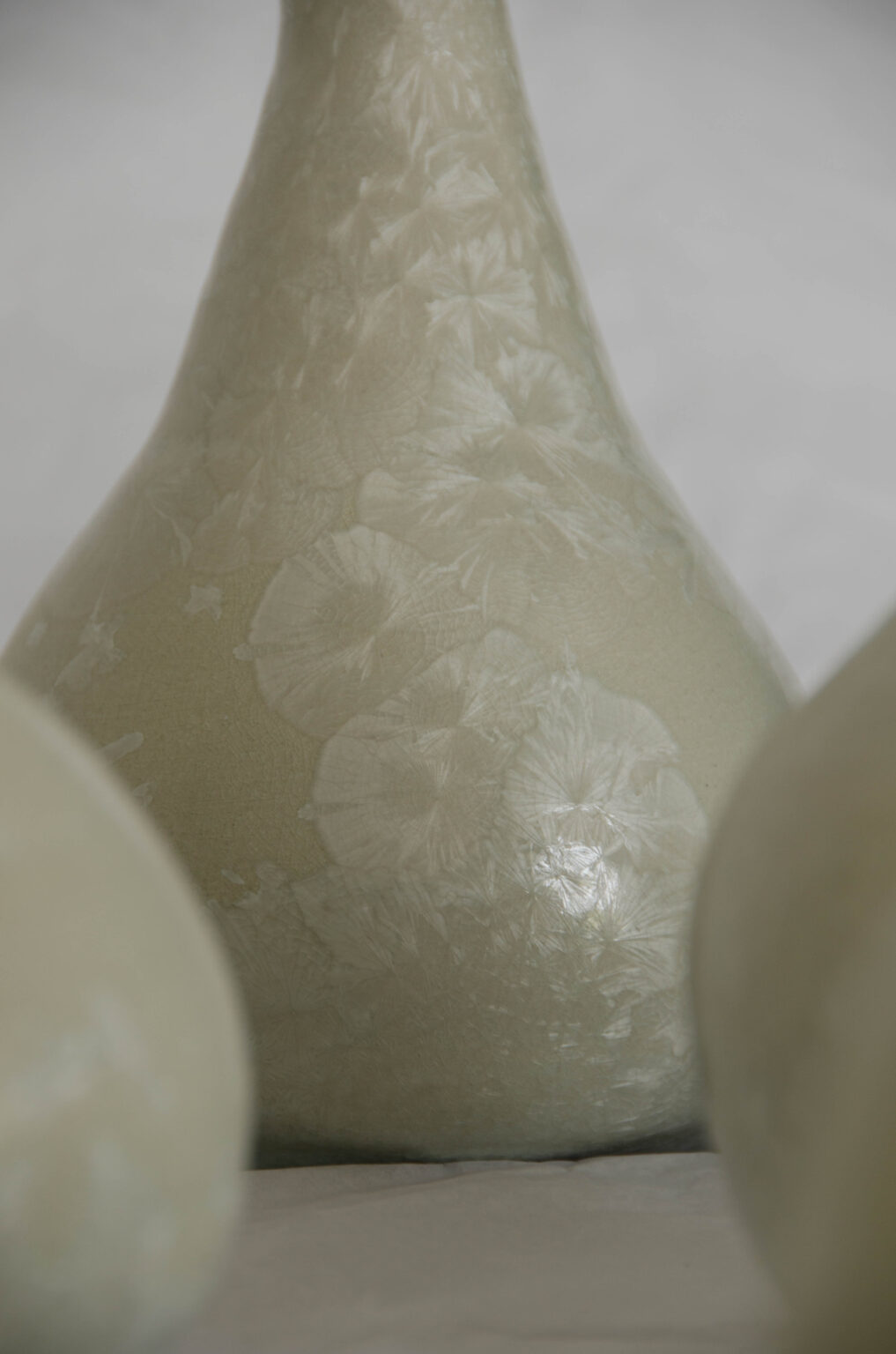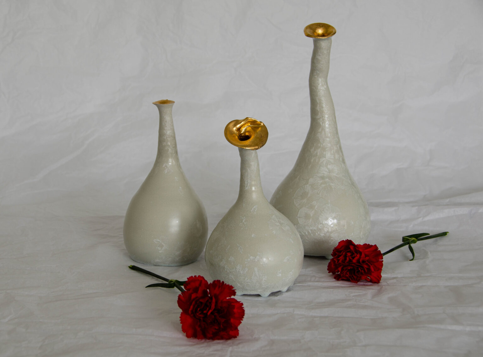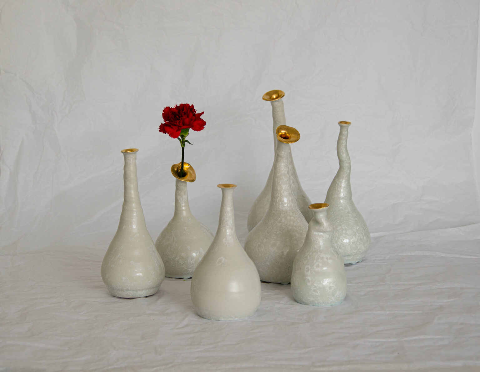 Les danseuses sont réalisées au tour de potier. Ces vases sculpturaux en porcelaine sont recouverts d’un émail à cristaux, tandis que les têtes sont rehaussées d’or. Chaque pièce est unique.